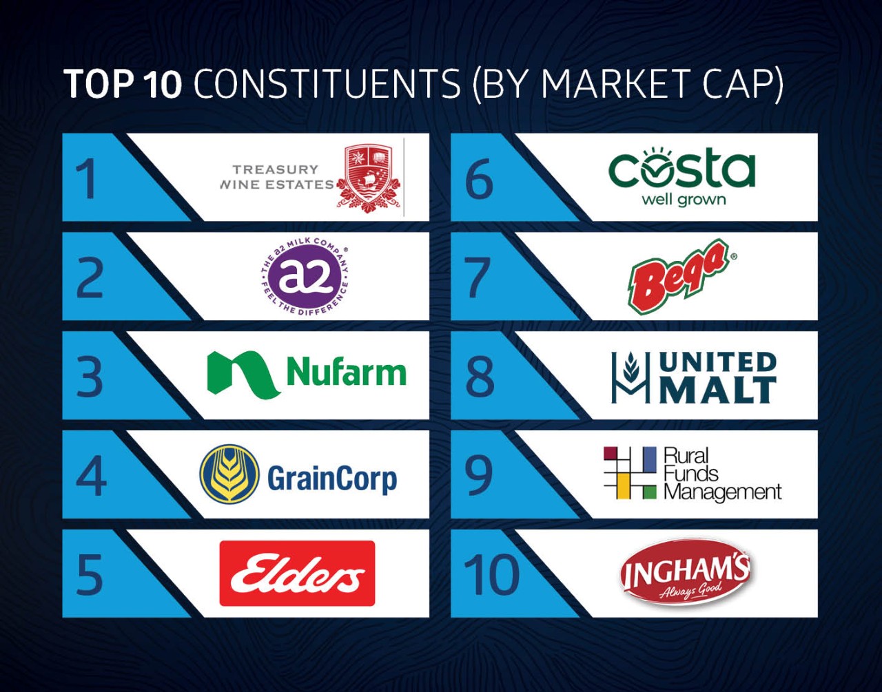As at the May 2022 rebalance, there were 25 constituents – the largest five being Treasury Wine Estates (ASX: TWE), A2 Milk Co (ASX A2M), Nufarm (ASX: NUF), GrainCorp (ASX: GNE), and Elders (ASX: ELD).