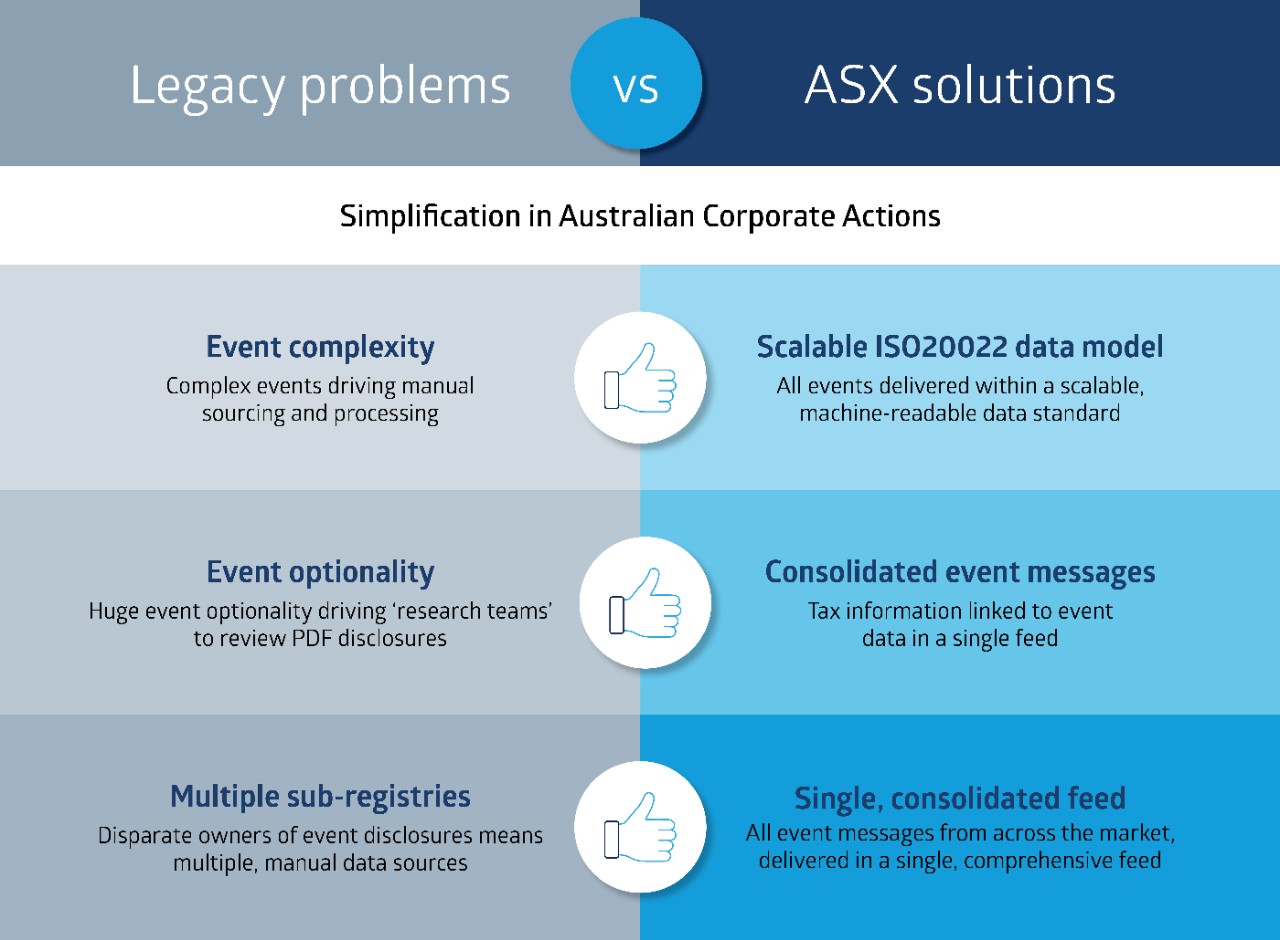 ASX is proud to sponsor an industry-wide benchmarking program on corporate actions processing in Australia, conducted by The Value Exchange. Insights from over 60 firms in the Australian corporate action community are detailed in a comprehensive report designed to help financial organisations chart the right course for change tomorrow.