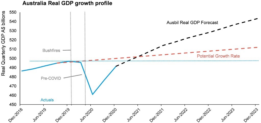 | Real GDP % year average 27 April 2021 | 10-year average 2010 to 2019 % | Pandemic Actual 2020 % | Ausbil 2021 (f) % | Official Sector Consensus 2021 (f) % |