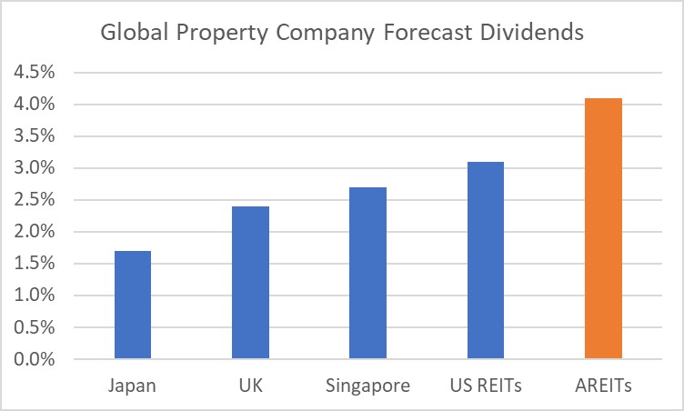 This ratio is expected to rise as companies become less risk averse. The ratio is expected to climb closer to 75% in FY22, back to pre-pandemic levels. Globally, A-REIT yields are compelling, as the chart below shows.
