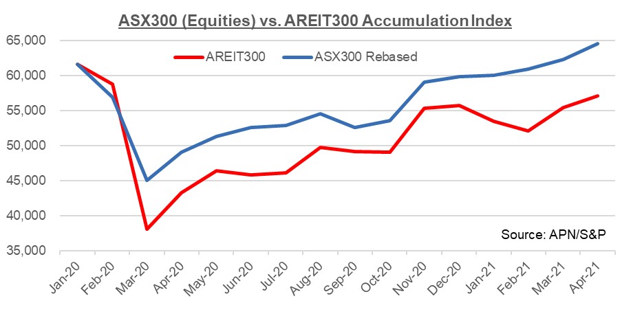 These factors were the writing on the wall for the A-REIT sector. Having reached a high over 64,000 in late February 2020, the ASX300 A-REIT index fell 37% in March 2020 as investors tried to comprehend the implications of the pandemic.