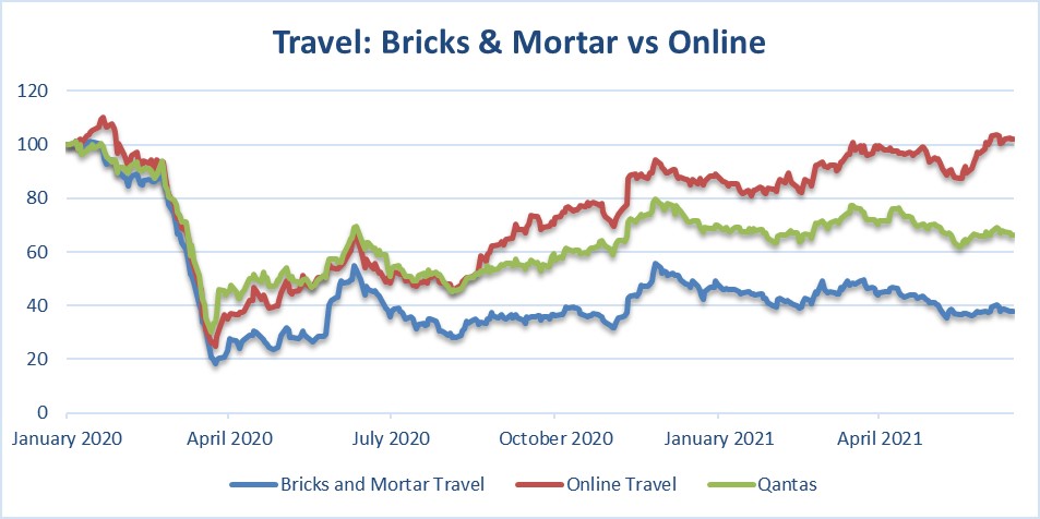 The chart also shows it has been such a difficult period for travel stocks that even the online-based businesses have only just recovered their share prices over the last 18 months.