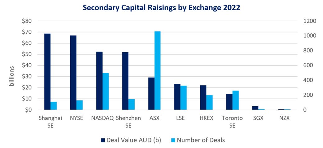 ASX was the top-ranked exchange globally for the volume of secondary capital raisings in 2022 with 1,060. This more than doubled the comparable volume on the NASDAQ exchange in the United States, more than tripled the volume on the London Stock Exchange and was higher than any exchange in Asia-Pacific.