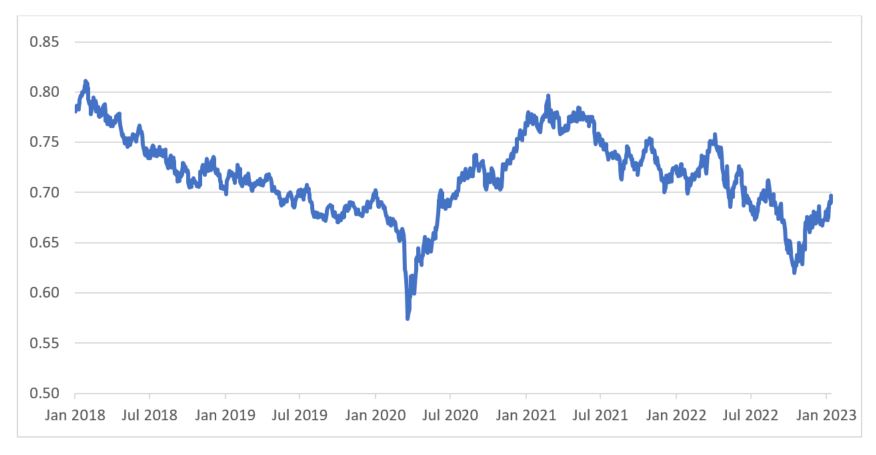 The AUD fell to US62c in October 2022, but has since recovered to around US70c in January 2022.