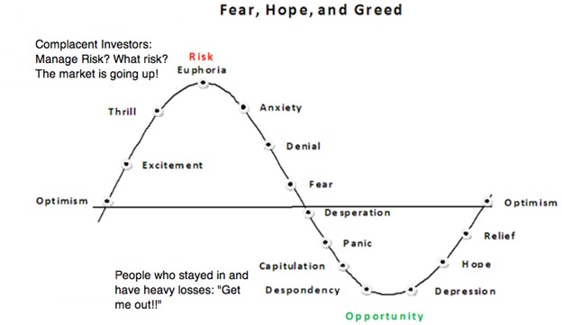 In a rising (bull) market, our optimism, and the excitement of rising values, can lead us to think that we will continue, or start, making gains easily. Fuelled by feelings of hope and greed, we may increase our level of risk just when prices have already risen significantly, investing more at precisely the time we should be cautious.