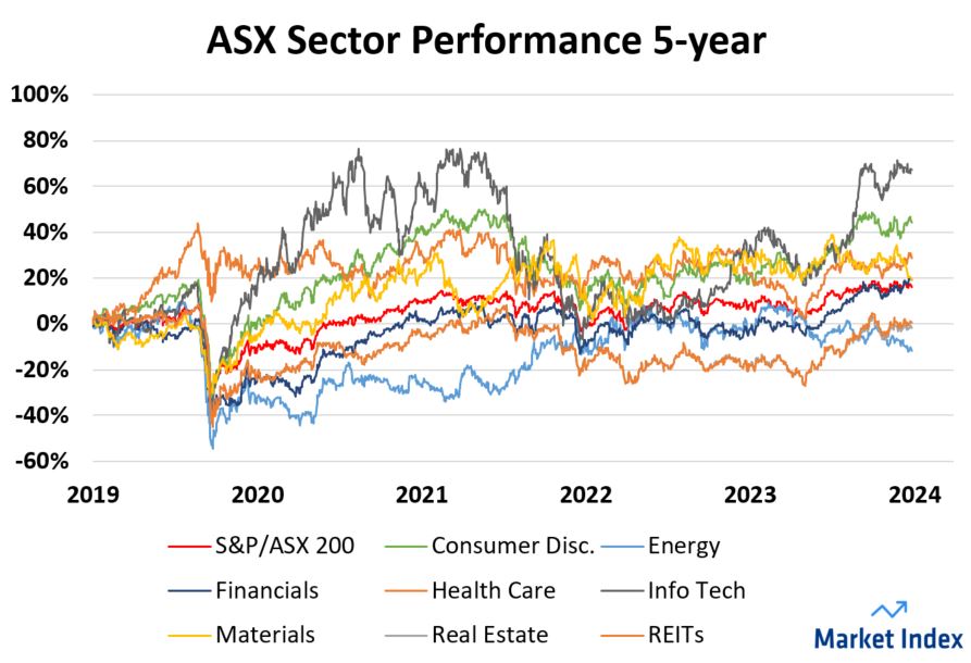 The tech sector was the ‘it’ sector for newcomers to share investing in 2020. The sector has rebounded to lead market gains over five years, as indicated in the chart above (charcoal-coloured line).