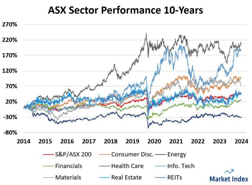 As shown the 10-year chart from Market Index above, some key sectors that appear to be outperforming in recent times have significantly underperformed the ASX 200 over the last 10 years, including financials and energy stocks. However, investors should be aware that this is not a guide to future performance.