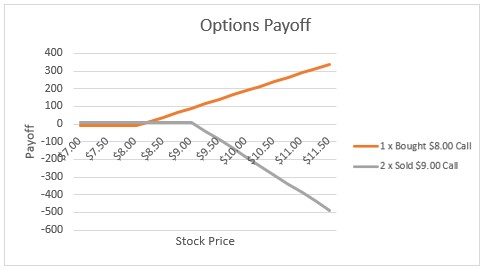 In order to repair the stock position, the client will buy 1 x $8.00 March Call for $0.10 and sell 2 x $9.00 March Calls for $0.05 each providing the below payoff schedule.