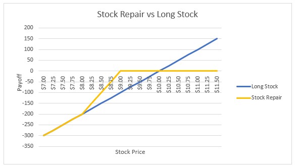 Should the share price remain below $8.00, both the bought $8.00 Call and sold $9.00 Calls will expire worthless, with the investor retaining the stock. As the cost of the bought Call was offset by the premium received for the sold Calls, the investors payoff for Stock Repair vs Long Stock only is the same.