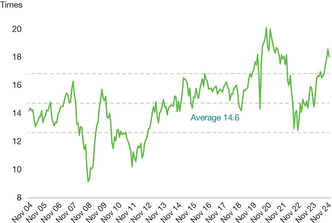 For A-REITs, uncertainty about the direction of interest rates might delay the recovery of real asset values. Banks are also trading at high valuations in a climate where earnings growth is expected to slow. This divergence in sectoral performance has left the broader market trading at levels around 18% above its 20-year average valuation, as the chart below shows, highlighting the challenges ahead [1].