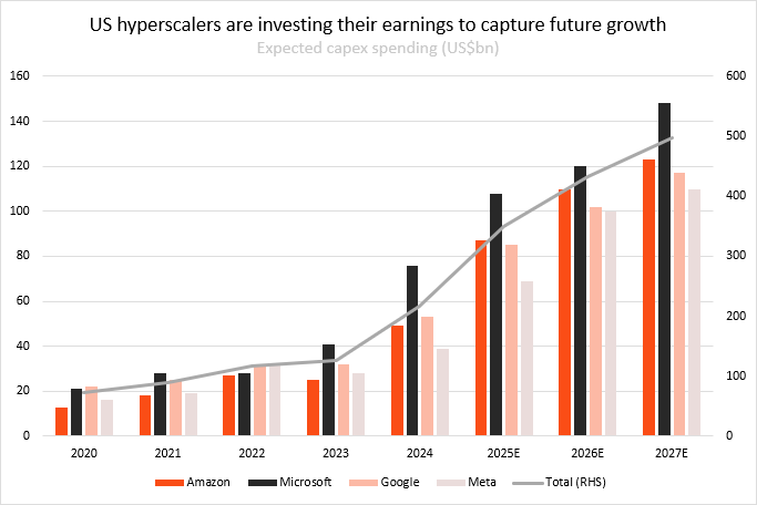 This year alone, these companies are expected to spend more than US$340 billion in capital expenditure [3] , (see chart below) - a scale that’s already influencing US economic growth and supporting the broader semiconductor supply chain.