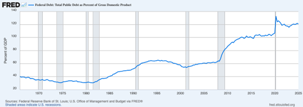 There are also growing concerns about the United States’ fiscal position where debt-to-GDP is running at historically high 122%, or US$36 trillion, as the chart below shows. This is some US$13 trillion, or 56%, more than just five years ago, based on Federal Reserve Bank of St Louis data.