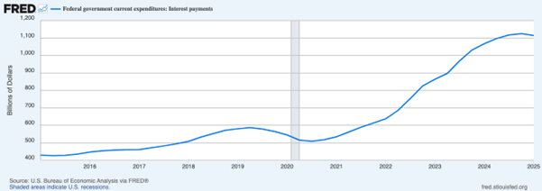 Higher rates have the potential to be self-reinforcing, given that the US government is adding more than US$1 trillion in interest expense to its balance sheet annually to maintain the existing debt load, as the next chart shows.