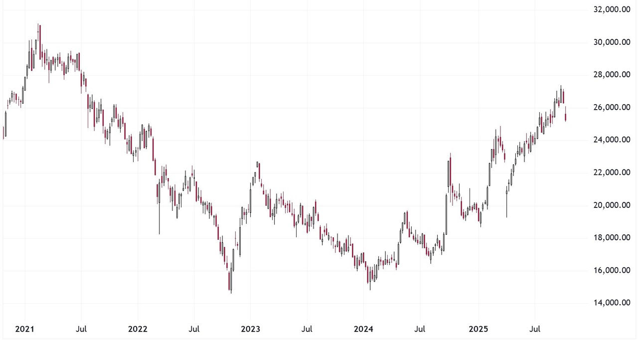 In comparison to the indices described above, the Hang Seng has a lot more volatility. The dip in 2022 saw the index break under the COVID-19 low and the rebound since then has seen many deep pullbacks along the way. This is an index that chartists will find hard to understand whether pullbacks along the way are just short-term dips or have potential to lead to larger corrections. At the moment the index appears to be in a long-term uptrend, but this could change quickly.