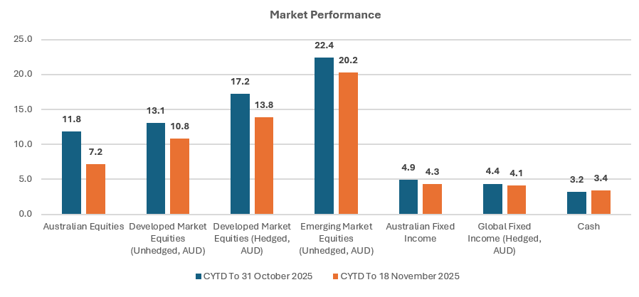 For Australian investors, 2025 was shaping up to be another good year for global markets, with every major asset class returning positive absolute returns through to the end of October.