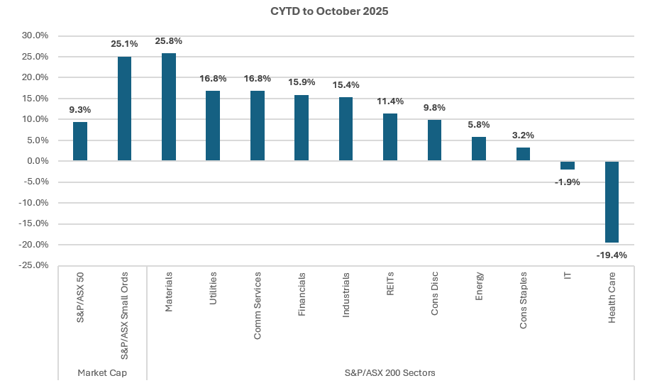 From a market capitalisation (market cap) perspective, Australian large-cap stocks (S&P/ASX 50 Index) produced high single-digit returns to 31 October 2025, as the chart above shows.