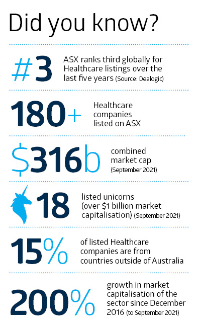 This ability to quickly raise capital is a significant advantage of being a listed entity, and became a key factor at the start of the COVID-19 pandemic – when markets crashed and volatility was high. ASX-listed companies were able to quickly and efficiently raise additional capital. In 2020, the ASX ranked first across global exchanges by number of secondary offerings, and ASX-listed healthcare companies raised $4.6 billion in total in this period, according to Dealogic. This capital was used to strengthen balance sheets; to take advantage of growth opportunities through mergers and acquisitions (M&A); and to accelerate R&D, regulatory and commercialisation activities.