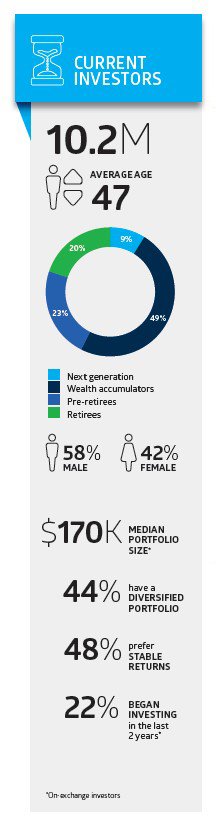 Looking at some of the other investor groups, considerations vary, depending on age and proximity to retirement. For wealth accumulators, the top considerations when investing in this age group include potential investment returns (43 per cent), the potential risk of an investment (33 per cent) and diversification of their portfolios (17 per cent).