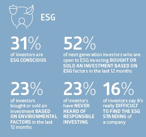 While 31 per cent of investors are now ESG conscious, 52 per cent of next gen investors who are open to ESG themes have actually bought or sold an investment based on its ESG credentials in the last 12 months. But 16 per cent of all investors say it is difficult to find out the ESG standing of a company.