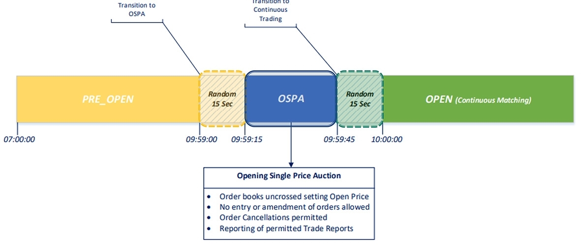 The transition to the opening single price auction, highlighted in the yellow stripes, will occur during a 15 second randomised window, between 9:59 and 9:59:15 (9:59 and 15 seconds).
