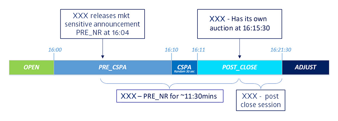 Post 23 June 2025: XXX releases a price sensitive announcement at 16:04. At 16:15:30, XXX will move from Pre-NR, into Post Close, generating its own closing auction during the transition.