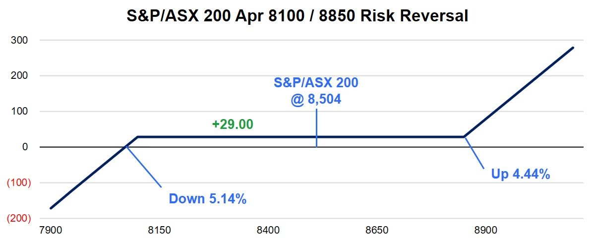 A few minutes later, on the same day (19 March 2026), a trader executed a structure that is surprisingly not used more with S&P/ASX 200 index options. With the index at 8,504, a trader sold 161 of the S&P/ASX 200 Apr 8100 Puts for 72.00 and applied those proceeds to purchase 161 S&P/ASX 200 Apr 8850 Calls for 43.00, resulting in a credit of 29.00 and a payoff shown below.