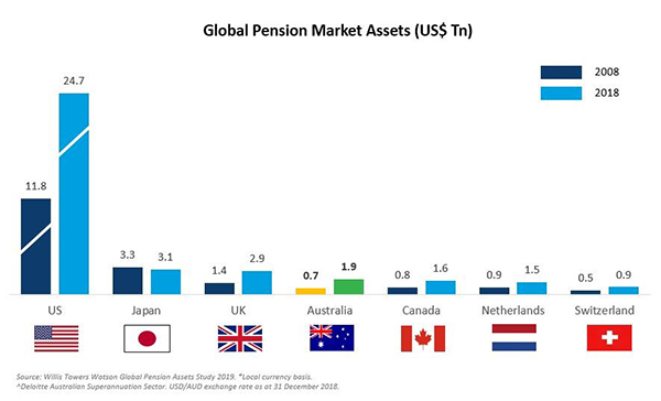 As shown in the graph above, Australia has the fourth largest pension pool globally and also one of the fastest growing. Superannuation assets total A$2.6 trillion and this is predicted to grow to A$9.5 trillion by 2035.