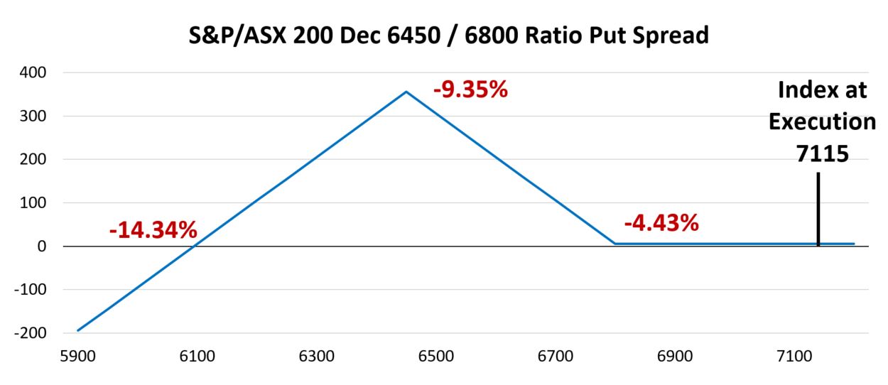 A trade possibly guarding against losses or speculating on a lower S&P/ASX 200 into the end of the year hit the tape on 21 August with the S&P/ASX 200 at 7115. In two lots a trader bought 500 21 Dec 6800 Puts for 117.60 and sold 1000 21 Dec 6450 Puts for 61.60 each resulting in a credit of 5.60 for each 1 x 2 ratio spread.