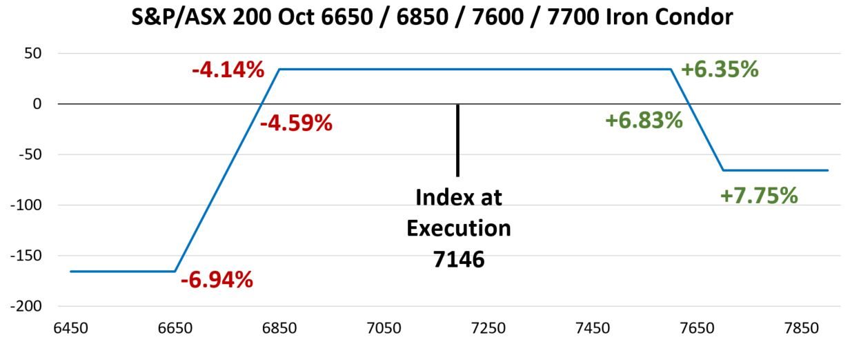 The best-case outcome for this trade is the S&P/ASX 200 falling between the short strikes by not losing more than 4.14% or gaining more than 6.35%. There is a little room for partial profits in each direction. The worst-case upside scenario has the index 7.75% higher while a drop of more than 6.94% would result in the maximum loss of 166 points.
