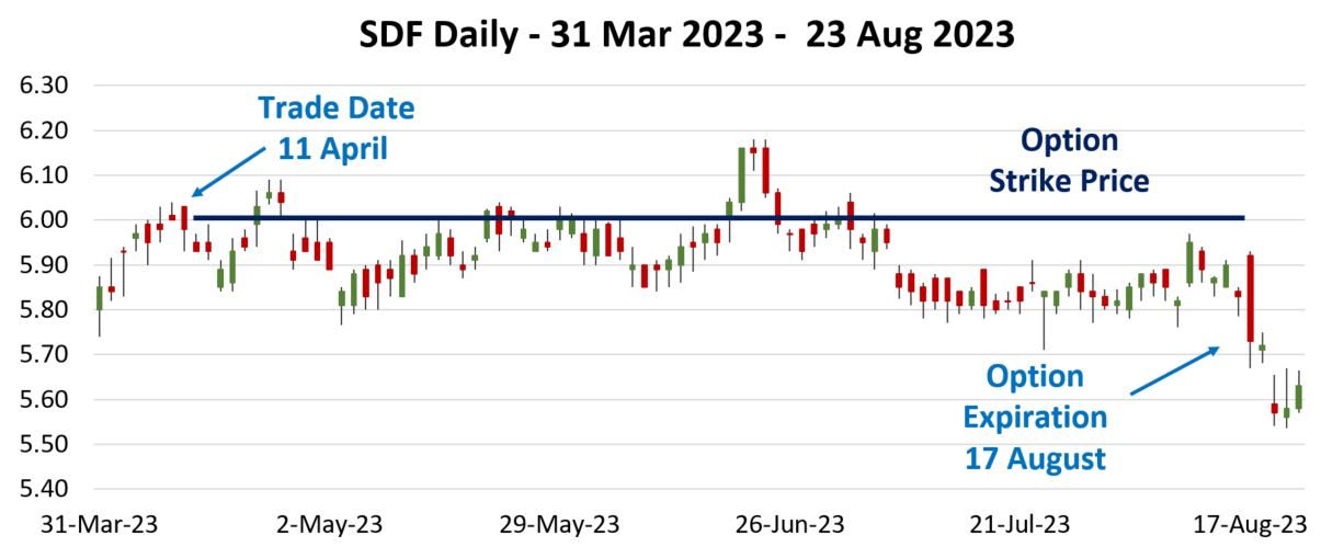 The trade date and option expiration data are both highlighted along with the call strike price (6.00). We have a few observations about this trade. First, the 0.30 credit per contract is also the profit for the option trade. The stock closed at 5.98 on the day of the trade in April, so this represents just over 5% of SDF’s share price. Note over the life of the trade the closing high for SDF was 6.16 on 20 June. The offer price for the SDF 17 Aug 6 Call was 0.30 on that day, so the short could have been covered for no loss. Finally, SDF closed at 5.73 on 17 August, 0.25 lower than 11 April, so the 0.30 income offset the lower stock price. Any way you look at it, this was a great call sale.