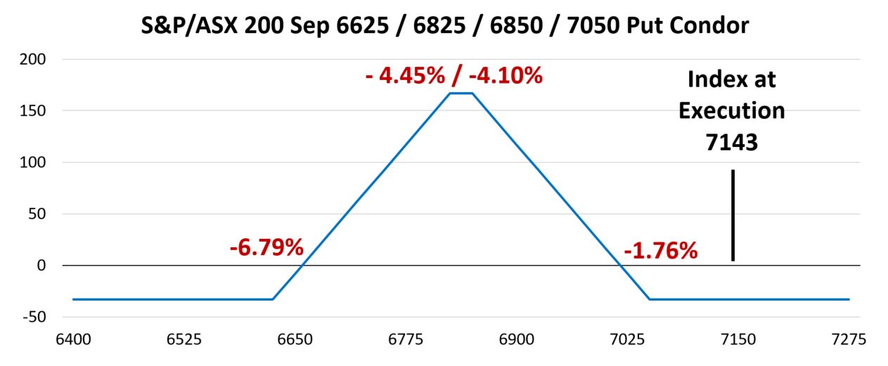 We were particularly interested in a couple of trades that were executed less than ten minutes apart on 17 August. With the S&P/ASX 200 around 7143 a trader initiated a condor by selling the 21 Sep 6825 Put for 37, also selling the 21 Sep 6850 Put for 41. The spread was completed by purchasing the 21 Sep 7050 Put and 6625 Put for 93 and 18 resulting in a debit of 33 points and a payoff that is depicted below.