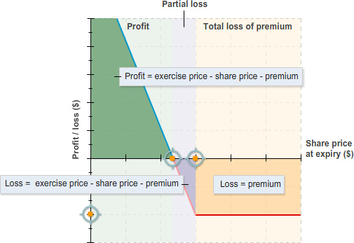 The most you can lose when you buy a put is the premium you paid. You will incur this loss if at expiry the share price is at or above the exercise price.