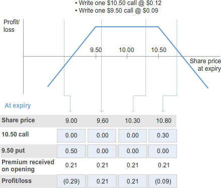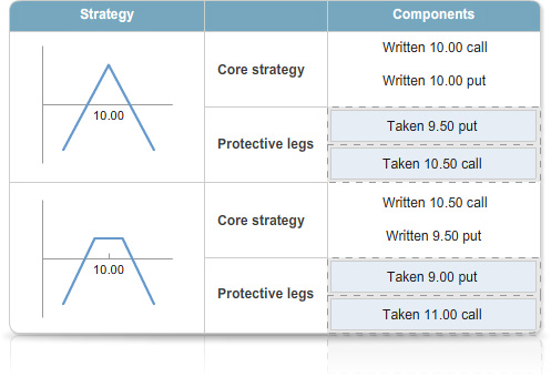 Adding the two taken options limits your risk. If the share price moves above $10.50, or below $9.50, the taken legs provide protection.