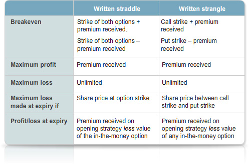 • The written straddle and written strangle are high risk strategies reflecting a neutral view.