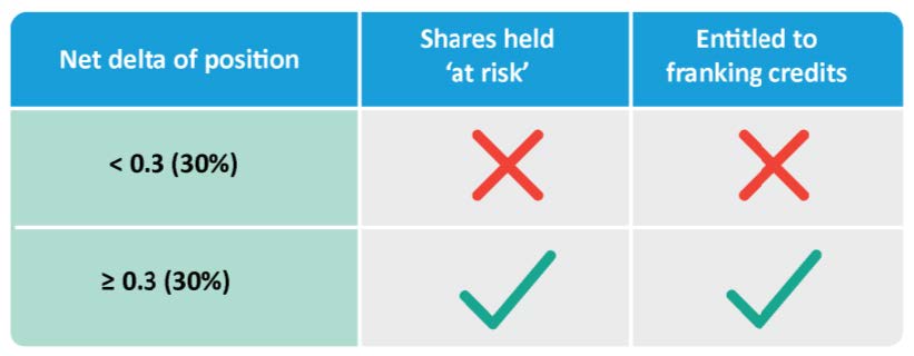 It is calculated by the Australian Taxation Office (ATO) via the net delta of the position. You are only entitled to the franking credits if the net position has a positive delta of 0.3 or higher (or 30% at risk). For full detail, refer to the ATO website.