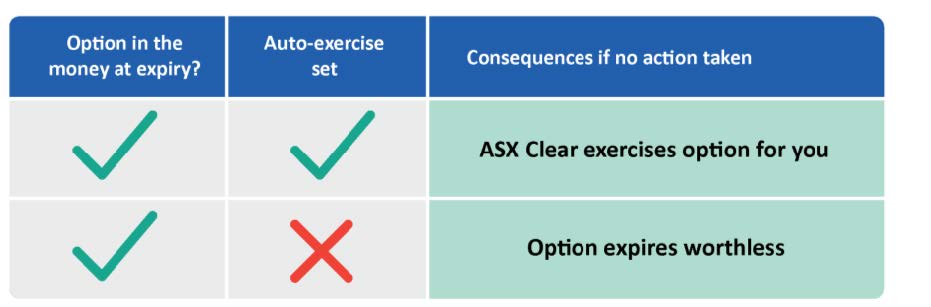 If your account is set up for auto-exercise, ASX Clear will automatically exercise any in- the-money options at expiry, without you having to lodge an exercise notice.