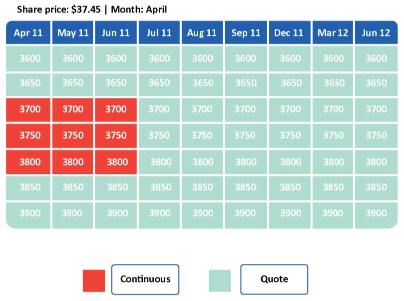The expiry months are represented along the top of the table (e.g. April 2024/5 & May 2024/5 etc.). The strike prices are represented down the table (e.g. $37 & $37.50 etc.).