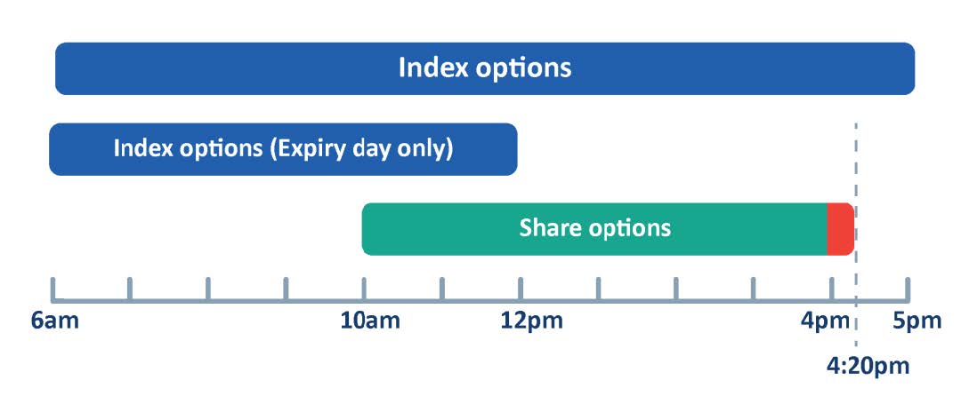 For index option options, normal trading is between 9.50am and 4.30pm. On the day of expiry, trading finishes at 12 noon.