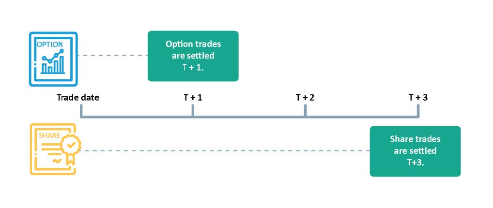 Option trades are settled one business day after the trade date (T+1). Share trades, in comparison, are settled T+2.