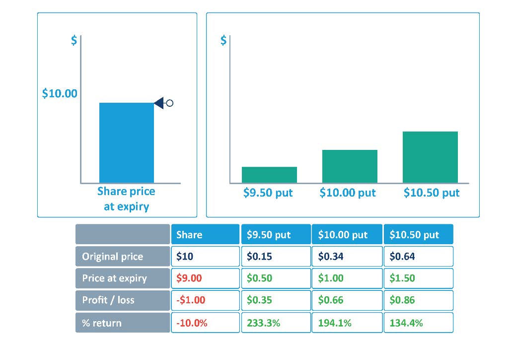 Buying a put option is as straightforward as buying a call option, involves limited risk and offers leveraged exposure to a falling share price.