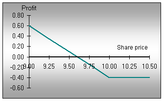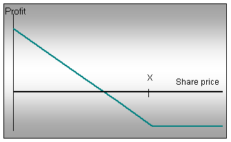 The maximum loss the investor can suffer is the premium paid for the option, which will occur if the share price at expiry is above the strike price. The investor breaks even if at expiry the share price is equal to the strike price of the option less the premium paid. As the share price falls beyond this point, the potential profits of the bought put are limited only by a fall in the share price to zero.