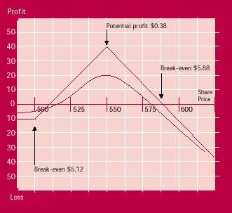 If the share price is at the higher strike price of the spread at expiry, the maximum profit point will be reached. The potential for profit is partly dependent on how many calls have been sold against each call taken. Generally the ratios are opened on a 1:2 basis and rarely higher than 1:3 due to the increased risk this would introduce should the shares rise strongly.