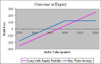 If the market falls: Where the index level is below the current level of 3000 at expiry, then because the call option is sold at 3050, any index value at or below this level means the option expires worthless. The seller keeps the option premium and overall the buy write portfolio outperforms the benchmark . Of course the long stock portfolio suffers, but is cushioned by the premium earned on the option.