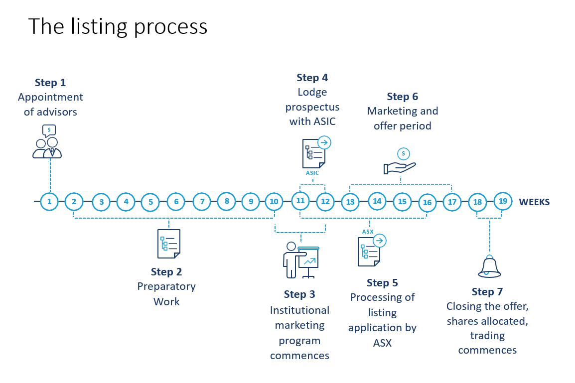 This includes drafting the prospectus, listing application and other required documents and undertaking a due diligence process. In some cases, it may also include applying to ASX for in-principle advice on the suitability of the company for listing on ASX.