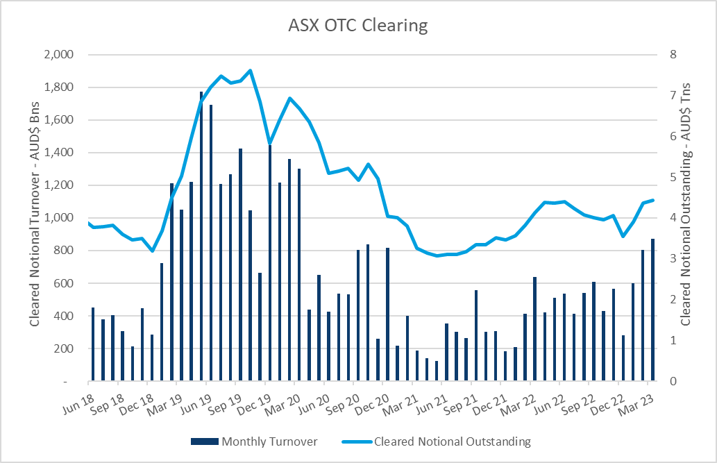 ASX introduced new customer requested product functionality during 2022 to support customers clearing Asset Swaps and swaps with IMM AUD rolls. Activity in these products grew substantially in Q1 with over $50bn notional value leveraging the new functionality.