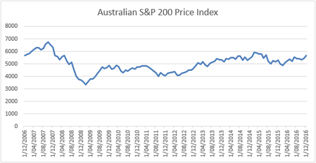 On its own, price growth of Australian shares is underwhelming. Over the 10 years to the end of 2016, the ASX/S&P200 price index has tracked predominantly sideways, as highlighted in Chart 2. In price terms, it still hasn’t returned to its pre-GFC highs recorded on 1 November 2007.