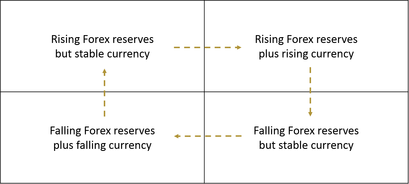 Despite significant intervention the currency is still falling. This is not a good place for any central bank to be in, particularly when you are coming off the end of one of the largest credit bubbles ever seen in the history of modern finance. The tightening of liquidity is of course raising worries about the fragile financial system and causing a selloff in risk assets. Chart 2 sums up the situation well - China has now moved into the bottom left quadrant.
